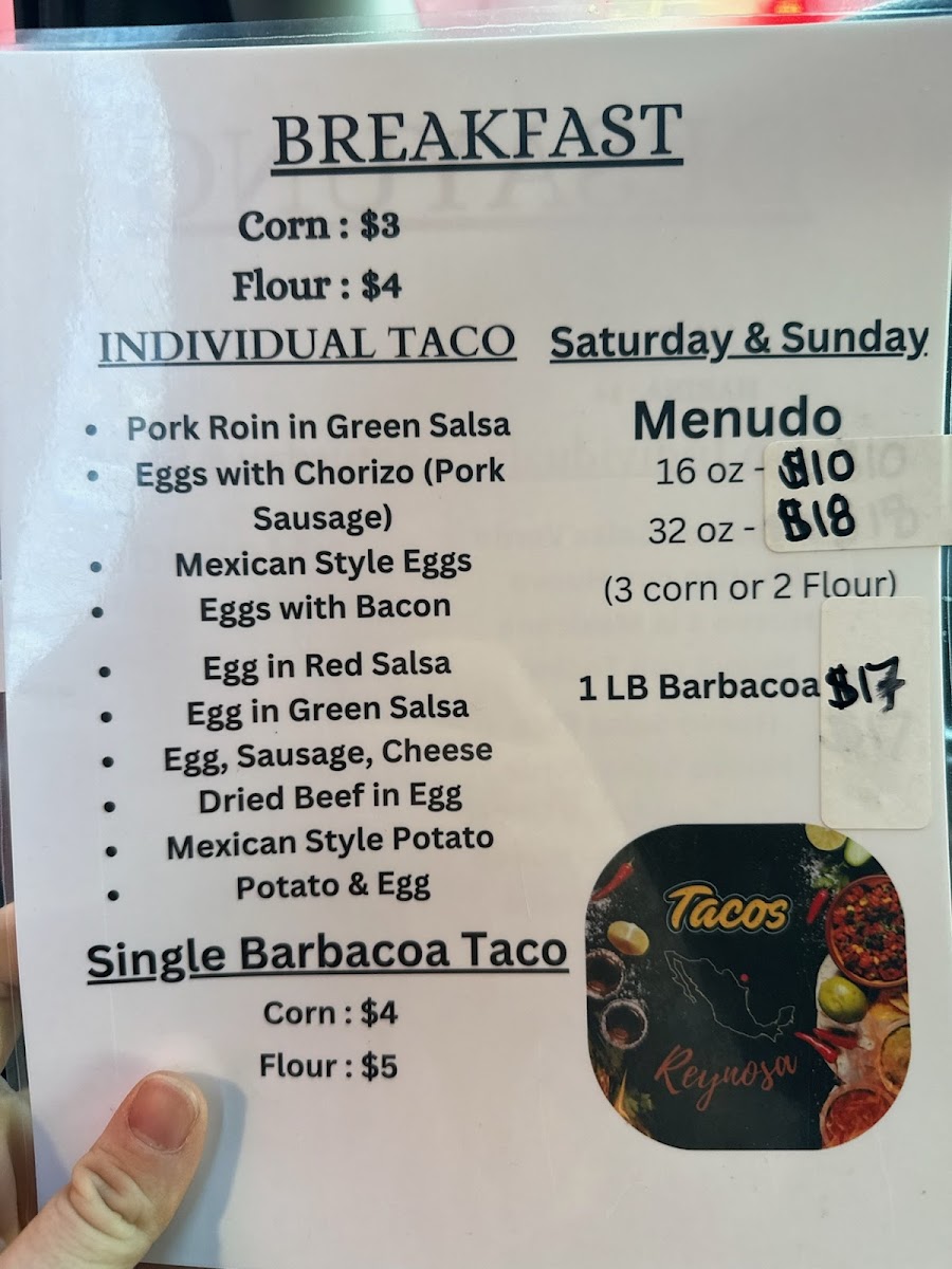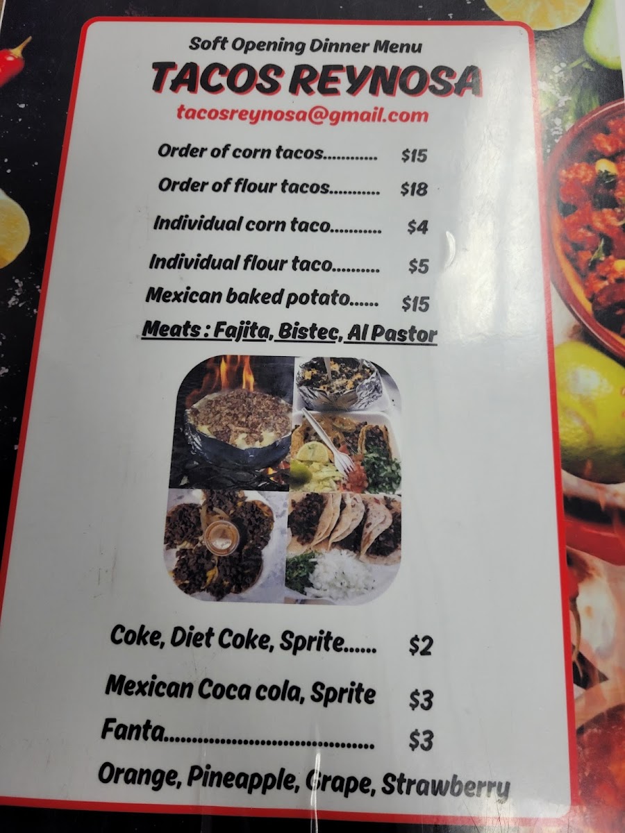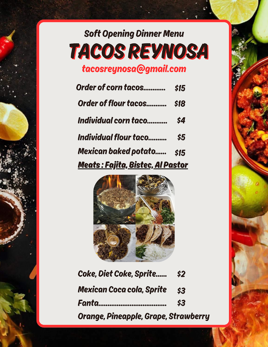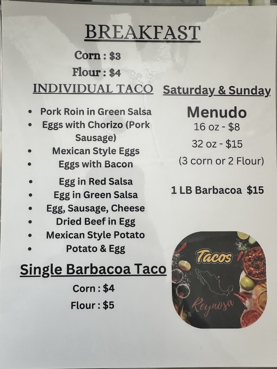Overall, Tacos Reynosa’s menu offers a compact yet satisfying selection that highlights both traditional flavors and hearty breakfast staples. Weekend options like PLATE Chilaquiles Salsa Verde, 2 Huevos, Frijol provide a classic start to the day, while the Desayuno - Taco Individual choices-ranging from Maiz/Corn Huevo, Sausage, Queso, Maiz/Corn Papa Mexicana, Maiz/Corn Machacado Con Huevo, to Maiz/Corn Huevos Con Chorizo, along with their Harina/Flour Machacado Con Huevo counterpart-give diners flexibility and familiar comfort. The main menu continues this straightforward appeal with items such as the Individual SOPE, 8oz Elote En Vaso, 12oz Coca-Cola, Orden De Tacos De Maíz, and the Quesadilla Meal (With Meat). Altogether, the menu balances simplicity and authenticity, offering well-loved Mexican dishes that feel both approachable and flavorful for anyone visiting this West Fargo spot.